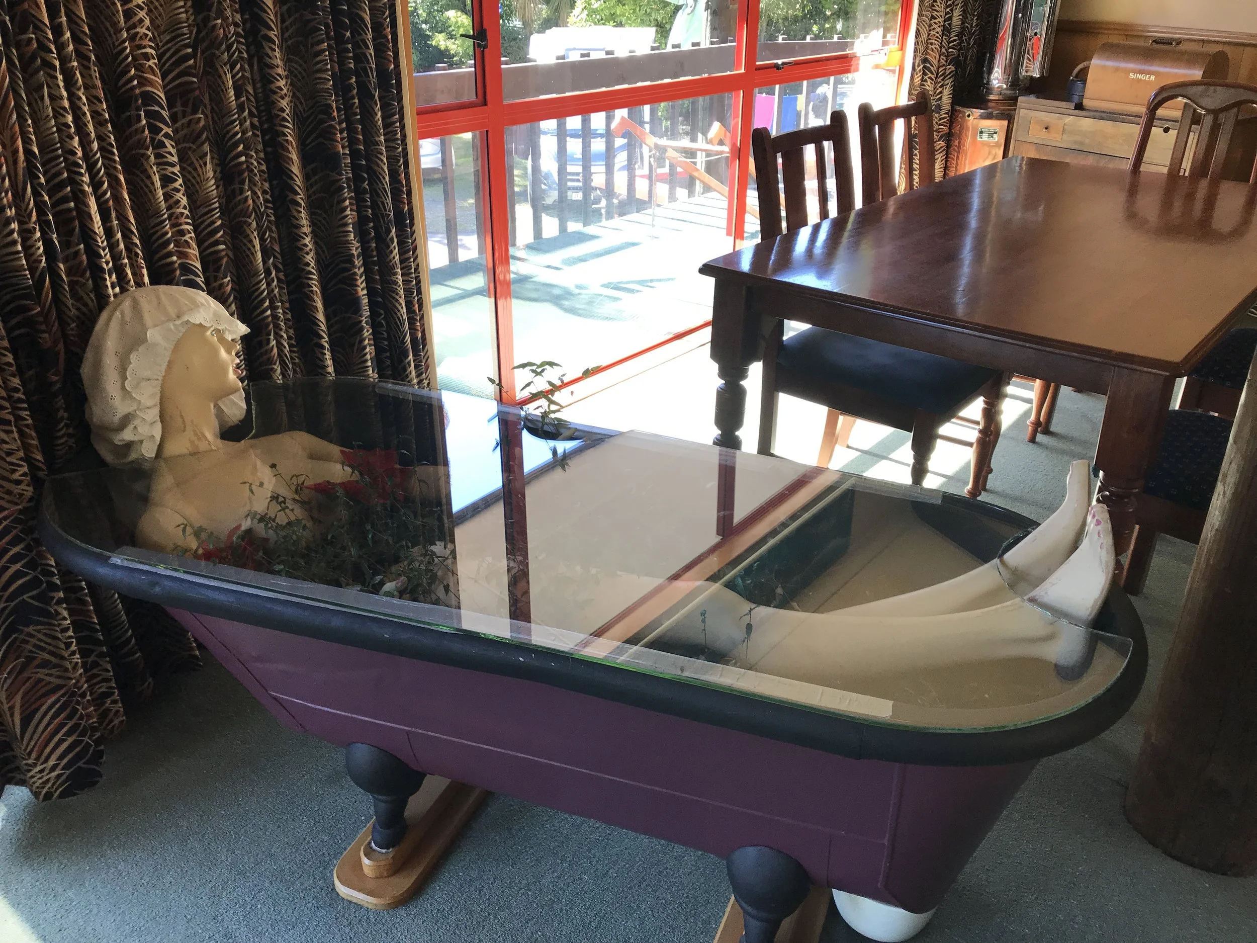 We also discover the “adults-only ‘Lady in the bath’” lounge upstairs that has a bizarre collection of old grandma-style antique furniture, paintings of King George, the TSS Earnslaw steamship, and some very weird sculptures of a woman in a bathtub with plants growing in the tub and a few other oddities. But it’s sunny and quiet and we can charge our phones and computers and use the wifi there.